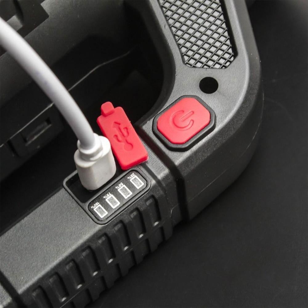 مصباح بالشحن وباور بانك للتخيم هو جهاز متعدد الوظائف مصمم خصيصًا لعشاق المغامرات والأنشطة الخارجية. يحتوي هذا الكشاف LED المتعدد الوظائف 5 في 1 على مصباح عالي الطاقة بقوة 18 واط مع ضوء طوارئ أحمر/أزرق، مما يجعله خيارًا مثاليًا للتخييم، الرحلات، أو الطوارئ.