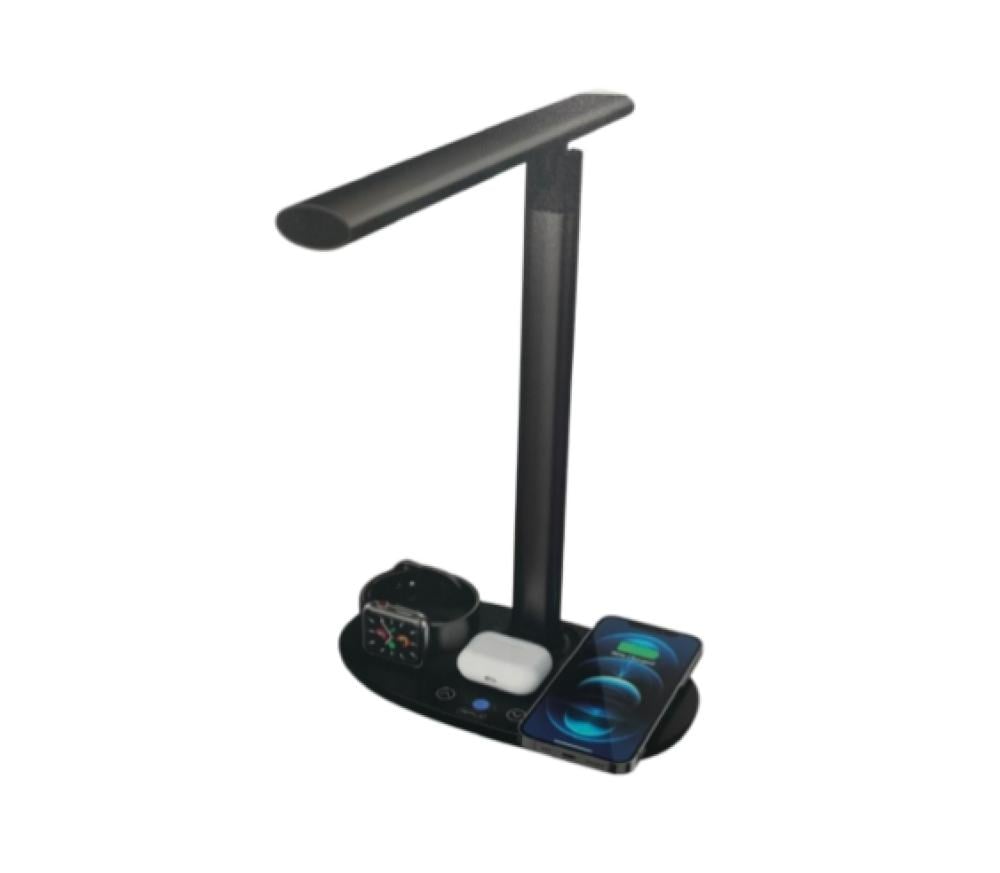 محطة شحن لاسلكي و مصباح لاسلكي مكتبي باللون الأسود، بتصميم 4 في 1 يجمع بين الإضاءة الذكية والشحن المتعدد في جهاز أنيق وموفّر للمساحة. مثالية للمكاتب وغرف النوم، وتتيح لك شحن هاتفك وساعتك وسماعتك اللاسلكية في نفس الوقت أثناء العمل أو الدراسة.